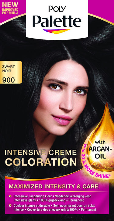 Met Poly Palette 900 Zwart krijg je niet alleen prachtige kleurintensiteit, maar ook een stralende glans. De crèmekleuring, verrijkt met Arganolie, dringt door tot in de haarkern en verzegelt de kleurpigmenten voor een langdurig resultaat.