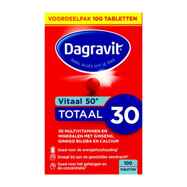 Dagravit Totaal 30 Vitaal 50+ multivitaminen zijn speciaal geformuleerd om te voldoen aan de veranderende voedingsbehoeften van volwassenen boven de 50. Deze complete formule bevat essentiële vitaminen en mineralen, aangevuld met ginseng en ginkgo biloba, die bijdragen aan een gezonde energiehuishouding en de cognitieve functies ondersteunen. Een dagelijkse dosis helpt om eventuele tekorten aan te vullen en de algehele vitaliteit te bevorderen, waardoor u zich optimaal kunt blijven voelen.