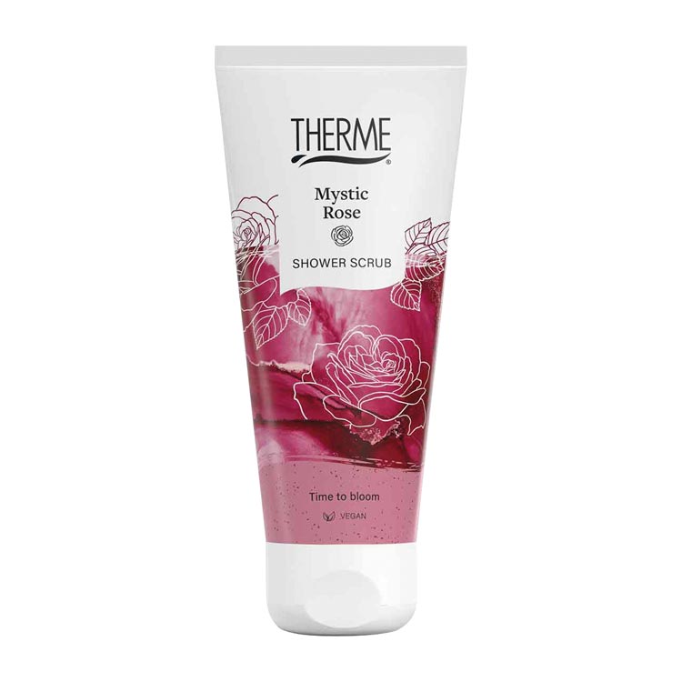 Ervaar de luxueuze verwennerij met de therme mystic rose shower scrub, een zachte bodyscrub verrijkt met natuurlijke scrubdeeltjes die op milde wijze dode huidcellen verwijderen en de celvernieuwing stimuleren, de unieke formule combineert de rijke, bloemige geur van roos met de zoete toetsen van lychee en de verleidelijke warmte van cacao, waardoor een onweerstaanbare geurbeleving ontstaat die je zintuigen prikkelt en je huid zijdezacht laat aanvoelen.