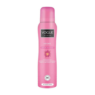 voel je de hele dag door zelfverzekerd met de Vogue Adore Parfum Deodorant. Deze unieke formule combineert de frisheid van een deodorant met de verfijning van een parfum. De geavanceerde technologie zorgt voor een langdurige bescherming tegen ongewenste geurtjes, terwijl de lieflijke geur van bloemige frisheid, tropisch fruit en warme amber- en vanilletonen je zintuigen prikkelt. Geniet van een subtiele, maar onmiskenbare geur die je de hele dag omhult.
