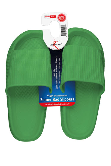 Deze moderne groene badslippers combineren het beste van twee werelden. Het ergonomische design zorgt voor de juiste voetpositie, terwijl het eigentijdse uiterlijk perfect past bij jouw stijl. Het lichtgewicht materiaal voelt aangenaam aan en de slippers zijn gemakkelijk schoon te houden.
