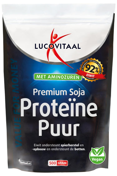 Lucovitaal Premium Proteïne Puur bevat 92 % plantaardig soja-eiwit isolaat, rijk aan alle essentiële aminozuren. Het hoge eiwitgehalte ondersteunt de groei van spiermassa en draagt bij aan botaanmaak. Het product is niet-genetisch gemodificeerd en geschikt voor veganisten.