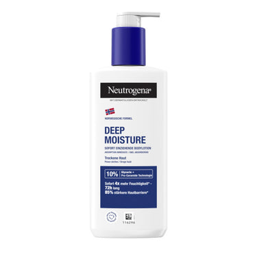 de Neutrogena bodylotion deep moisture biedt tot wel 72 uur intensieve hydratatie dankzij de nieuwe pro-ceramide technologie, deze technologie versterkt de essentiële ceramiden in de huid, waardoor de huidbarrière wordt versterkt en de huid gekalmeerd en beschermd wordt, de lotion trekt direct in, waardoor je je direct na het aanbrengen kunt aankleden, de niet-vette formule is speciaal ontwikkeld om het risico op allergieën te minimaliseren en is zelfs geschikt voor de gevoelige huid.
