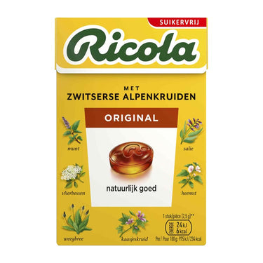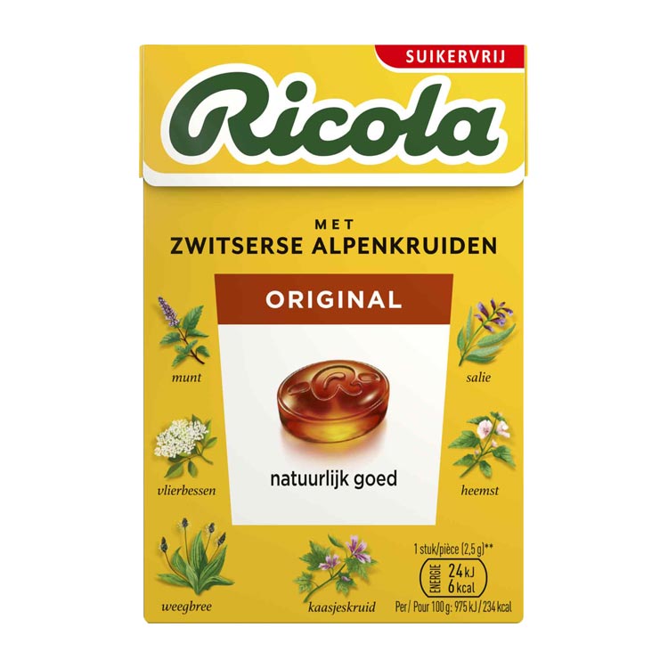 Ricola Original suikervrije pastilles combineren 13 zorgvuldig geselecteerde Zwitserse alpenkruiden. Elke kruid draagt bij aan een verzachtend en aromatisch profiel, terwijl de natuurlijke zoetstof stevia de smaak zonder extra suiker levert. Met 3,5 mg menthol per pastille wordt de keel snel verlicht.